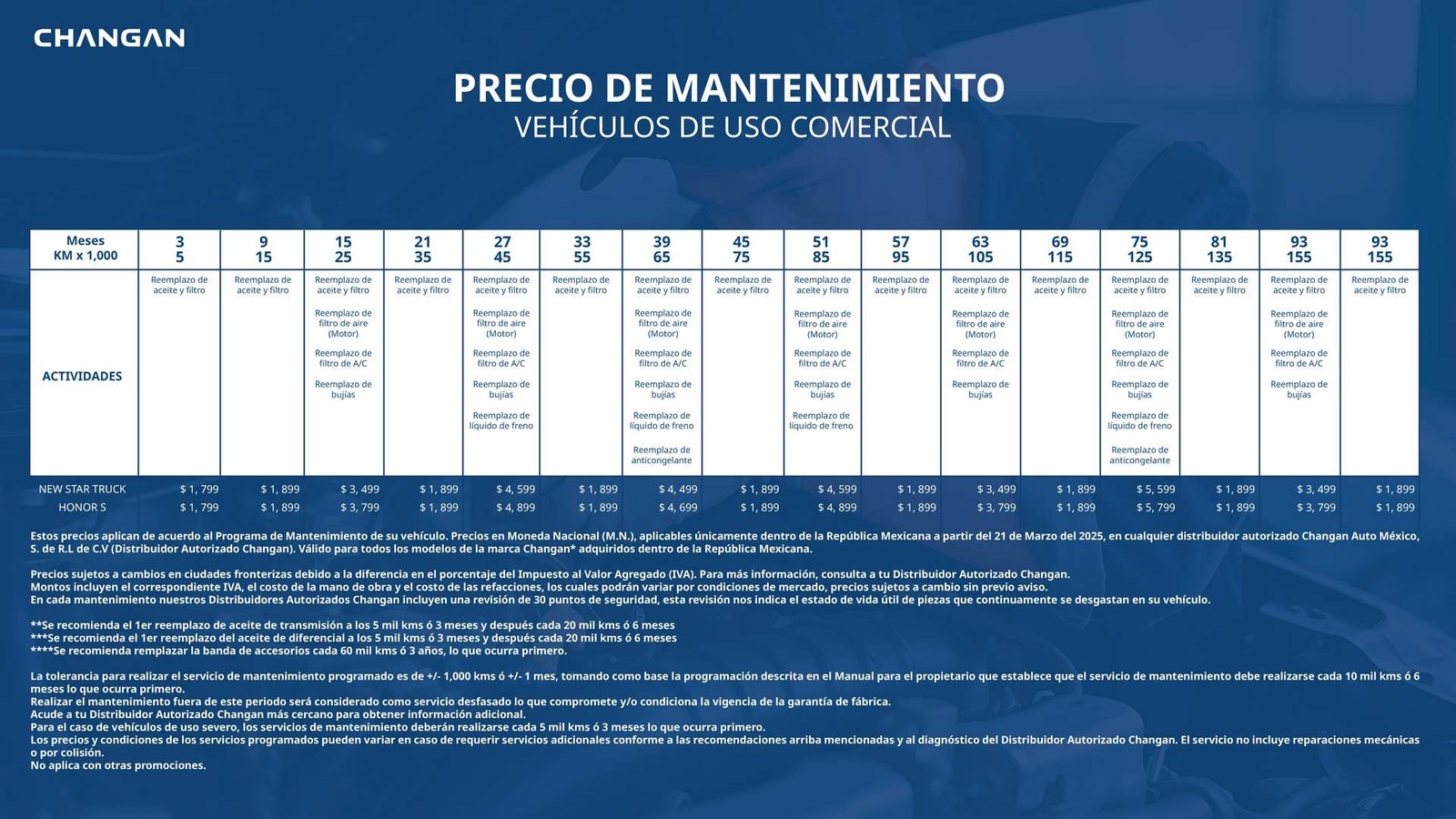 Los precios y condiciones de los servicios programados pueden variar en caso de requerir servicios adicionales conforme a las recomendaciones arriba mencionadas y al diagnóstico del Distribuidor Autorizado Changan. El servicio no incluye reparaciones mecánicas o por colisión.