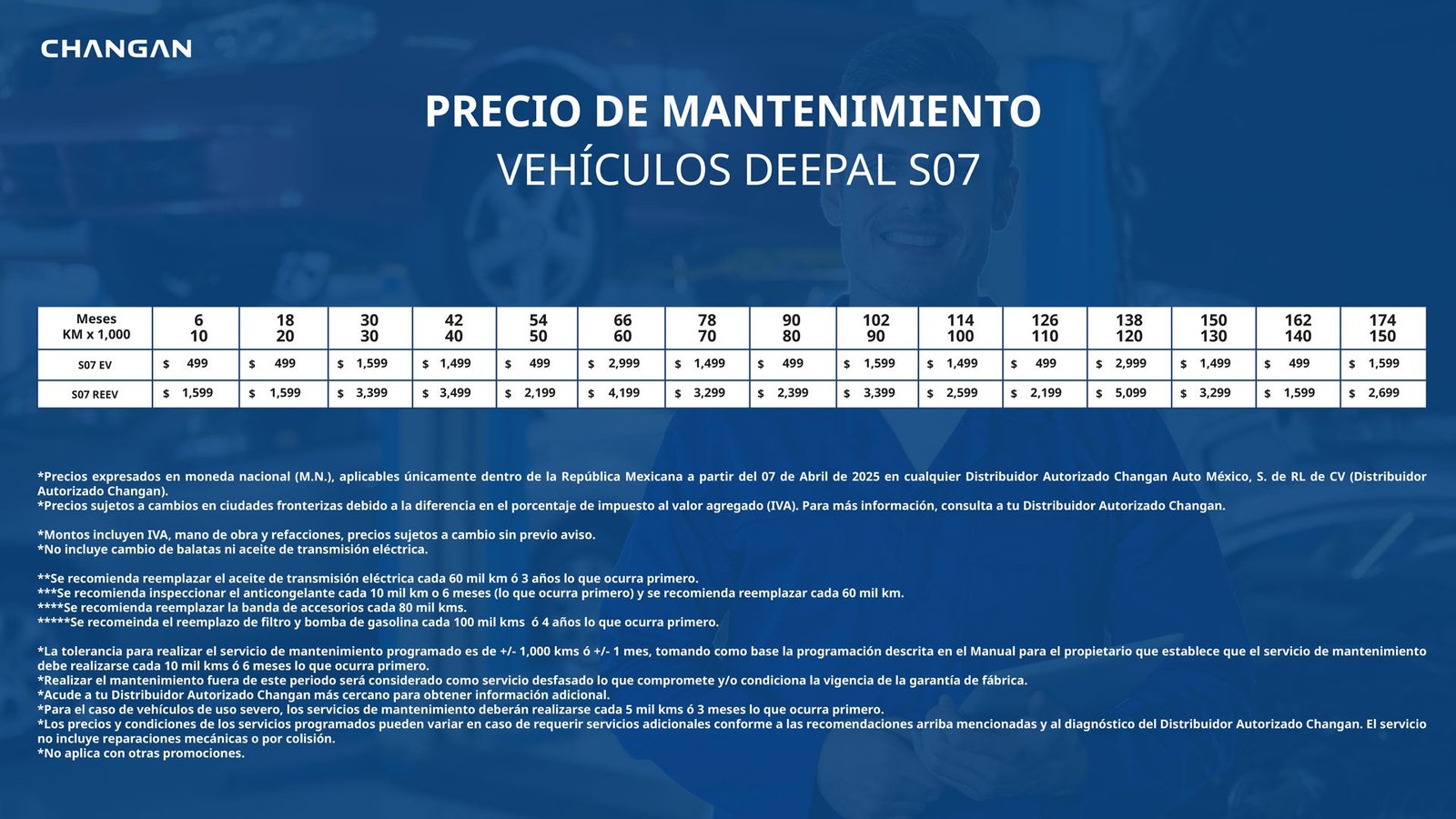 Estos precios aplican de acuerdo al Programa de Mantenimiento de su vehículo. Precios en Moneda Nacional (M.N.), aplicables únicamente dentro de la República Mexicana a partir del 21 de Marzo del 2025, en cualquier distribuidor autorizado Changan Auto México, S. de R.L de C.V (Distribuidor Autorizado Changan). Válido para todos los modelos de la marca Changan* adquiridos dentro de la República Mexicana. Precios sujetos a cambios en ciudades fronterizas debido a la diferencia en el porcentaje del Impuesto al Valor Agregado (IVA). Para más información, consulta a tu Distribuidor Autorizado Changan. Montos incluyen el correspondiente IVA, el costo de la mano de obra y el costo de las refacciones, los cuales podrán variar por condiciones de mercado, precios sujetos a cambio sin previo aviso.